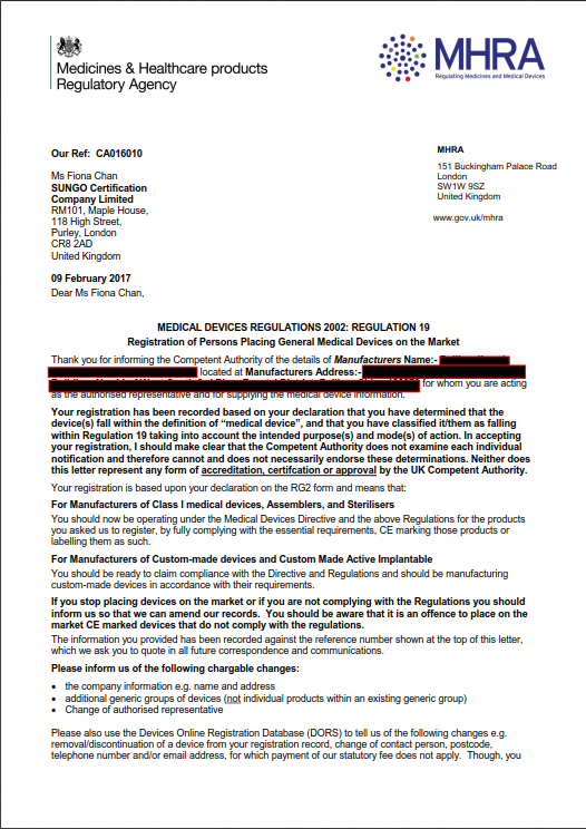 敖维科技可以提供英国医疗器械企业主管当局MHRA的注册服务,以及荷兰医疗器械主管当局的医疗器械注册服务。注册信函样本请见下图: